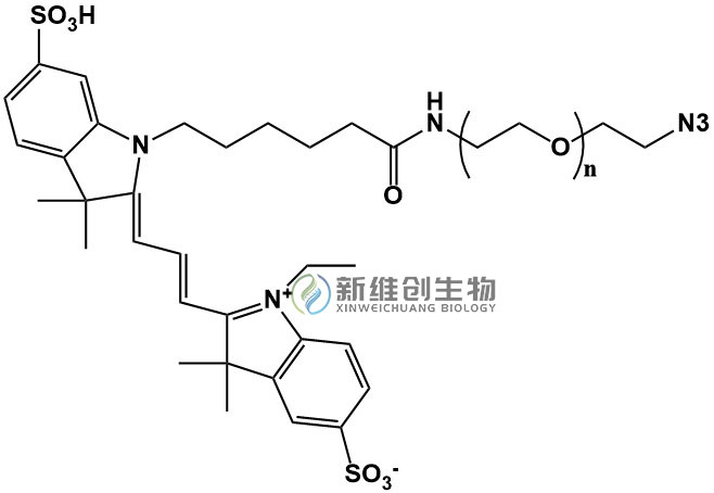 Polyethylene glycol can be used to modify proteins, peptides, and materials. Functionalized polyethylene glycol can also increase solubility and stability, reducing the immunogenicity of peptides and proteins. It can also inhibit the non-specific binding of charged molecules to modify the surface. Cy3-PEG-Azide is applied in medical research, drug release, nanotechnology and new material research, and cell culture. In the research of ligands, peptide synthesis carriers, graft polymer compounds, new materials, polyethylene glycol modified functional coatings, and active compounds.